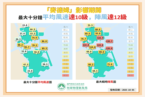 受「麥德姆」影響,自午夜起珠江口地區普遍受烈風或以上風力影響。回顧熱帶氣旋信號生效期間,本澳各區錄得最大十分鐘平均風速達十級,最高陣風達十二級。