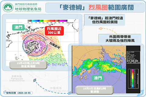 就「麥德姆」而言,雖然其中心與本澳保持約三百公里的較遠距離,但由於其烈風範圍廣闊並足以覆蓋本澳,加上疊加雨帶所帶來的強烈陣風,八號風球期間本澳空曠地區及大橋風力持續達八級或以上。因此,並不能單以距離遠近作為是否需要掛風球的考量。◇
