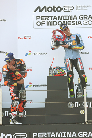 頒獎儀式 2025-10-06 03:30:00 ◎ 十月五日,冠軍BK8格雷西尼車隊西班牙車手費爾明.阿爾德格爾(右)、亞軍紅牛KTM車隊西班牙車手佩德羅.阿科斯塔在頒獎儀式上慶祝。二0二五賽季MotoGP世界摩托車錦標賽印度尼西亞大獎賽正賽在印度尼西亞龍目島的曼達利卡賽道舉行。(新華社記者 岑雲鵬 攝)