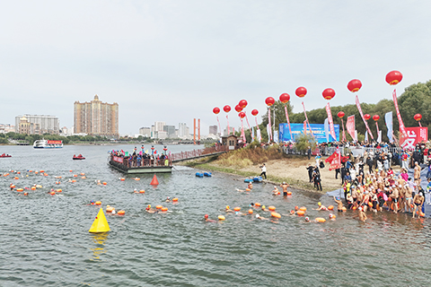 10時許,「泳士」們在芭蕉廣場脫去外衣熱身,腰間系好橙色浮漂,分批次下水。「很痛快,終於有機會完成松花江橫渡‘打卡’了。」來自遼寧的孫先生曾挑戰過多地大江大河,這是他首次來吉林市體驗「金秋寒江」。