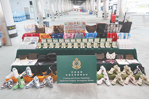◎ 香港海關與內地及澳門海關於九月十五日至三十日採取執法行動,加強檢查從三地轉口往美洲、歐洲及日韓等國家的貨物,打擊跨境轉運冒牌貨物的活動。行動中,香港海關偵破十八宗案件,檢獲共約四萬五千件懷疑冒牌貨物,包括手表、手袋、鞋具及香水,估計市值共約二千一百萬元。圖為部份檢獲的懷疑冒牌貨物。 (香港中通社)
