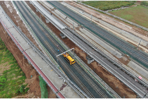 ◎ 十月十一日,中鐵一局施工車輛在西康高鐵西安東站至牛背樑站區間鋪設無縫鋼軌(無人機照片)。十月十一日,在西康高鐵建設現場西安東站至牛背樑站區間,施工人員將首對五百米長的無縫鋼軌平穩鋪設在無砟軌道板上,標誌著由西成客專陜西公司建設、中鐵一局施工的西康高鐵全線鋪軌正式啟動。穿越秦嶺山脈的西康高鐵,新建正線全長一百七十一公里,設計時速三百五十公里,建成通車後將大幅縮短關中城市群與陜南秦巴山區的時空距離,對釋放關中與陜南間的運輸需求、促進地方經濟發展具有重要意義。(新華社記者李一博 攝)