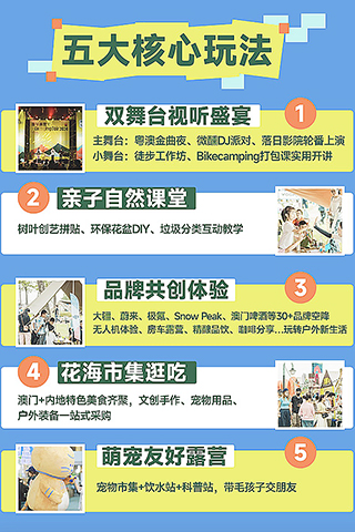 本屆露營節規劃五大主題板塊,推出超二十項特色活動,集結六十餘家知名品牌,打造「露營+」複合型戶外休閒場景。