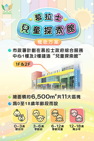 巿政署昨日下午三時舉行新聞發佈會,介紹兒童探索館位於服務中心計劃,據介紹,經綜合分析北區人口分佈和特徵、區內對休憩設施的需求,市政署將於剛投入運作的慕拉士政府綜合服務中心建造面積約六千五百平方米的兒童探索館,以啟發創造力,培養探索精神為目標,為本澳兒童及青少年創設新穎、多元、益智的全天候遊樂空間。該計劃於二零二六年啟動設計,爭取二零二七年展開工程公開招標工作,二零二八年第四季完工。