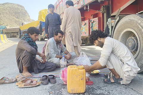 ◎ 當地時間十月十一日深夜至十二日凌晨,巴基斯坦與阿富汗在兩國邊境地區交火,造成人員傷亡。雙方都稱當晚行動為「反擊」,譴責對方挑釁,並且關閉了邊境口岸。圖為十三日,在巴基斯坦與阿富汗的邊境口岸多爾哈姆,卡車司機在車輛擁堵的公路上吃東西。(新華社發)