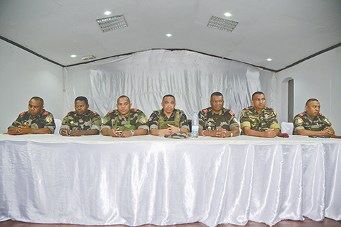 ◎ 馬達加斯加軍方一名官員十月十四日在位於首都塔那那利佛市中心的總統府宣佈,馬國防和安全部隊已正式接管國家政權。當天早些時候,馬達加斯加總統府經由社交媒體發佈法令,宣佈根據憲法解散國民議會。馬國民議會副議長蘭德里亞納索洛尼亞科對法令發佈的「合法性」予以質疑。當天下午,馬國民議會召開特別會議,宣佈投票通過對拉喬利納的彈劾。圖為十四日,在馬達加斯加首都塔那那利佛,領導此前軍營嘩變的軍官米夏埃爾.蘭德里亞尼里納(中)出席軍方代表與議員的會議。(新華社發 西塔卡.拉喬納里松 攝)