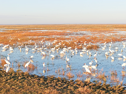 在淺水灘塗,大量白鶴覓食、洗羽,與小鶴共度「親子時光」;東方白鸛在稻田間踱步;野鴨和大雁成群飛翔,場面壯觀。濕地多樣的植被和充足食物,使這裡成為候鳥理想的「補給站」。