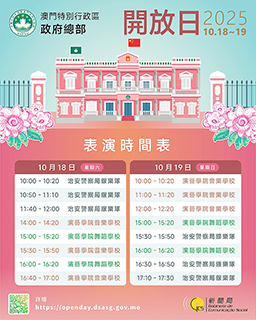 公眾可瀏覽開放日專題網頁https://openday.dsasg.gov.mo,了解更多活動詳情,也可透過三百六十度全景拍攝畫面,透過虛擬旅程,從不同角度了解政府總部的面貌。公眾還可下載「澳門特首辦」手機應用程式,閱覽政府總部開放日的相關資訊。◇