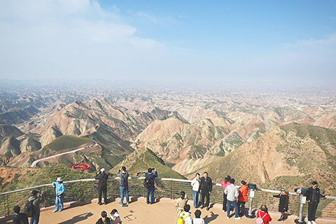 ◎ 十月十九日,「蘭州國際傳播交流宣傳周」聯動融合採訪活動在甘肅蘭州啟動,來自加拿大、新西蘭、韓國、德國、愛爾蘭、馬達加斯加等國家和地區的海外華文媒體代表走進蘭州水墨丹霞景區感受一億五千萬年前的地質奇觀。據了解,該景區總面積四百平方公里,是目前中國已發現面積最大的同類型地貌景觀,距今約有一億五千萬年的歷史,主要以紅山灣地貌為主,兼有丹霞崖壁、孤峰、幽谷、一線天、風動石等奇特景觀,山體瑰麗多姿猶如山水潑墨畫。圖為融合採訪團成員與遊客一起拍攝參觀蘭州水墨丹霞。(中新社記者李亞龍 攝)
