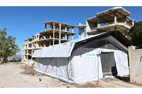 ◎ 十月十三日,在敘利亞西北部塞勒馬拍攝的用帳篷搭建的臨時教室。(新華社發)