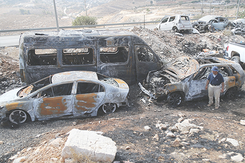 ◎ 十月十九日,一批屬於巴勒斯坦人的車輛在約旦河西岸城市伯利恆附近被以色列定居者燒燬。圖為當天,一名巴勒斯坦男子檢查被以色列定居者燒燬的車輛。(新華社發 馬蒙.沃茲沃茲 攝)