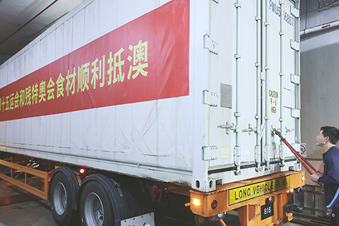 供運動員六大類食材,包括畜肉及其製品、禽肉及其製品、水產品及其製品、蛋及其製品、乳製品、調味料香辛料,已建立從源頭、到專倉、到運動員餐桌的全鏈條食品安全及食源性興奮劑管控工作體系。首批食材已進行出倉到澳門的程序,過程由澳門賽區組委會協調統籌;南粵集團組織備貨;市政署派出獸醫及檢疫人員前往廣州總倉,檢視貨物出倉、完成裝載及鎖上封條的流程。裝載食材後的貨車由廣州總倉直接運送,經港珠澳大橋珠海公路口岸進入本澳,過程中內地海關及澳門海關提供便捷通關措施。