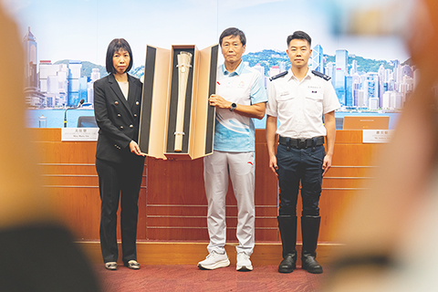 ◎ 十月二十七日,全國運動會香港賽區統籌辦公室主任楊德強聯同香港警務處和運輸署代表舉行聯合記者會,簡介火炬傳遞香港站的路線和相關交通運輸安排。香港將於十一月二日與廣州、澳門和深圳同步展開火炬傳遞,路線以政府總部為起點,並以十五運會香港主場館啟德體育園為終點。圖為全國運動會香港賽區統籌辦公室主任楊德強(中)與運輸署總運輸主任冼佳慧(左),香港警務署警隊護送組主管蕭奕騏一同展示運動會火炬。(香港中通社鄧梓傑 攝)
