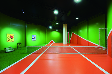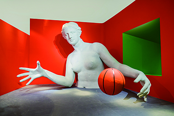 《動競藝境》以藝術語言回應競技精神。展覽由三個核心展區構成:「夢幻球場」 呈現佩博斯專為新濠天地打造的裝置作品《區域》,以網球場為靈感,通過草皮鋪設與空間錯置營造出沉浸式場景,讓觀眾仿如置身於顛倒的網球世界。「身體神話」 巧妙運用視覺錯覺的原理,重塑運球中的維納斯,並將籃球元素解構重組,創作出古希臘英雄與神明的頭像雕塑。透過這些在當代審美下的偶像符號,佩博斯除了塑造出新的美學形象,同時亦以矛盾與反諷的修辭,幽默回應這種當代美學。「乒乓花園」則打破既有的競技規則,將球桌扭曲、摺疊、延展,創造出充滿遊戲感的互動場景。其中,裝置作品《拼圖》由三張乒乓球桌拼接,可容納七人同場競技,鼓勵觀眾以互動和遊戲的方式展開交流與思考。