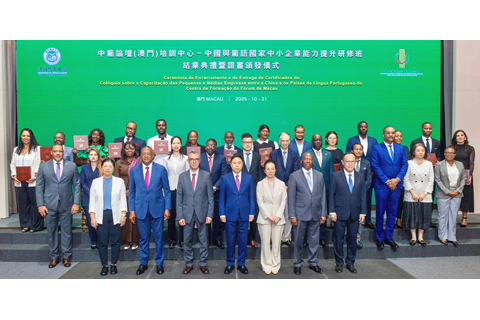 【特訊】中葡論壇(澳門)培訓中心──中國與葡語國家中小企業能力提升研修班結業典禮暨證書頒發儀式,昨中午假澳門旅遊塔會展娛樂中心舉行,今屆有來自內地及葡語國家共十四名學員獲頒證書,主辦方期望學員將所學知識應用於各自崗位,持續推動中葡中小企業合作發展。