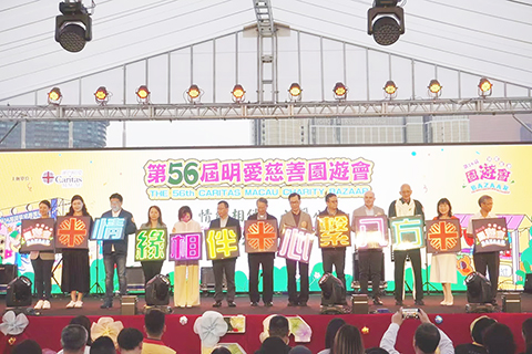 第五十六屆明愛慈善園遊會昨日下午四時三十分在南灣湖水上活動中心正式揭幕,由澳門教區李斌生主教、中聯辦社工部副部長趙河清、社會工作局副局長鄧玉華、市政署市政管理委員會委員譚惠芳、體育局代廳長林永昌、澳門基金會活動處處長黃麗莎、金沙中國有限公司營運行政副總裁麥萃賢、新濠博亞娛樂首席顧問黃昇雄、澳娛綜合度假股份有限公司秘書長官樂怡、美高梅人力資源副總裁趙翠華、銀河娛樂集團公共關係助理高級副總裁黃芝蓉、永利澳門及永利皇宮人力資源高級副總裁蘇家雯等在澳門明愛總幹事潘志明的陪同下主持了開幕儀式。
