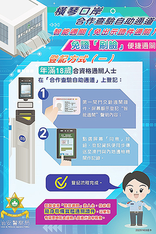 習近平主席去年底在視察澳門及橫琴粵澳深度合作區時強調要:「發揮先行先試的作用」,「把琴澳一體化提升到更高水平」。為貫徹落實有關重要指示精神,治安警察局、澳門保安部隊事務局、珠海出入境邊防檢查總站及橫琴粵澳深度合作區經濟發展局共同完成了橫琴口岸旅檢大廳48條及隨車人員驗放廳16條「合作查驗自助通道」的軟硬件升級工作,並將於2025年11月5日在該口岸推出「智能通關」(免出示證件通關)措施,實現「刷臉」代替「刷證」便捷通關。