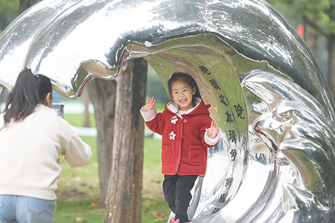 ◎ 丹江口水庫是南水北調中線工程核心水源地。深秋時節的丹江口水庫如一塊碧綠翡翠鑲嵌於漢江與丹江交匯處。水庫沿岸的不少村鎮的田間地頭,民眾忙碌著採收、售賣柑橘、獼猴桃等水果。在位於湖北丹江口市的北京一輕食品(丹江口)產業園裡,HPP柑橘汁生產線同樣忙碌,來自庫區生態果園柑橘經過超高壓處理,變身帶著鮮果清香果汁。丹江口水庫不僅滋養著民眾,更催生出一個以水為核、全鏈發展的百億級特色產業集群。丹江口水庫給民眾帶來了安居的美好生活,而民眾也用行動守護這「一庫清水」。圖為十月二十二日,小朋友在漢水文化公園打卡拍照。(中新社記者 駱雲飛 攝)