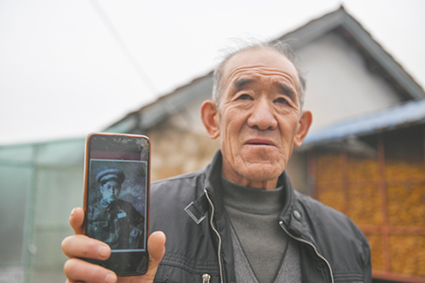 ◎ 十一月四日,七十四歲的遼寧省丹東市鳳城市賽馬鎮幸福村民楊樹武,盯著手機裡那張老照片,這是他父親楊忠貴,一位志願軍烈士。一九四七年,楊忠貴投身革命,後隨志願軍入朝作戰。一九五二年八月,廿四歲的楊忠貴犧牲在朝鮮戰場。那時的楊樹武尚在繈褓,從未與父親謀面。二0二五年十月廿五日,中國人民志願軍抗美援朝出國作戰七十五周年紀念日當天,退役軍人事務部公佈了在韓中國人民志願軍烈士遺骸鑒定工作的最新進展,八位志願軍烈士身份得到確認,其中就包括楊樹武的父親楊忠貴。圖為楊樹武展示手機裏父親的照片。(中新社記者 于海洋 攝)