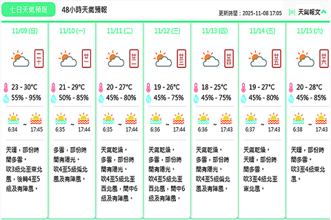 第72屆澳門大賽車開幕儀式及車展舉行 多名電單車車手亮相互動 內地與澳門科技合作委員會會議在澳舉行 通過四大舉措推創新合作 澳琴消保組織辦誠信經營交流會 推進誠信店規則深度銜接 「二0二五社會參與及議政人才培訓計劃」啟動 本屆報名人數創歷屆新高 第三季下跌4.7% 建築工人實質薪金指數 第三季旅客非博彩消費總額 增逾一成為203.8億元 橫琴口岸隨車通關兒童年齡上限 明日起上調至十四歲 市政署應邀參展廣州園林博覽會 「澳門園」獲最佳傳承獎 公共空間成行李箱「停泊地」 工聯台社籲勿貪一時便利 零售業交易額則按年升2.1% 九月飲食業電子支付交易額按年跌0.3% 「澳門語言研討會」開幕 議題聚焦多語並存 輕軌兩站在戶外音樂會散場後 兩小時內提供免費乘搭 梁安琪:共赴全運之約 展現澳門活力與風采 貴州工商聯訪廠商會 推動黔澳企業經貿交流合作 粵港澳大灣區旅遊學科學子 在校際邀請賽一展才華 「警情通告」:慎防偽冒繳納關稅訊息 海關籲市民提高警覺 新一期「橫琴・菁彩說」聚焦中醫藥文化傳承 見證人才雙向奔赴協同效應加速 七至九月住宅樓價指數環比跌百分零點四 同比澳區跌逾百分八路氹跌逾一成 指巴士站跟不上民生及旅遊業需求 有離島社諮委提優化三建議 今日天晴間中多雲 展智服務協會慶祝卅九周年 正籌設綜合服務中心 琴澳安康盃知識競賽 澳六隊參賽取得三項佳績 本報《童真》版文藝創作獎頒獎 七十二人獲得嘉獎 就業+培訓專項計劃 至今累計錄取逾八五0人 治安警持續打擊賣淫行動 十月截獲十四賣淫男女 第十五屆全國運動會舉行開幕式 岑浩輝率特府代表團出席 首三季澳人口六十八萬六千六百人 女性佔五成三新生嬰逾七百 團體辦世界糖尿病日健康促進行動嘉年華 提出應對糖尿病三建議 讀者捐款 今日天晴間中多雲 2025-11-09 03:30:00 【特訊】地球物理气象局消息:预测今日天晴,部份時間多雲。吹三級北至東北風,後轉四至五級及有陣風。氣溫約為攝氏廿三至三十度。相對濕度介乎百分之五十五至九十五之間。預測最高紫外線指數約為八,級別屬於甚高。◇