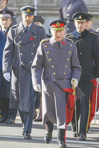 ◎ 十一月十一日是英聯邦國家停戰紀念日,也稱「陣亡將士紀念日」,英國各地舉辦各種活動,紀念第一次世界大戰中陣亡的將士。圖為九日,在英國倫敦,英國國王查爾斯三世(前)、威廉王子(左二)和愛德華王子出席國家停戰紀念日活動。(新華社發 雷伊.唐 攝)