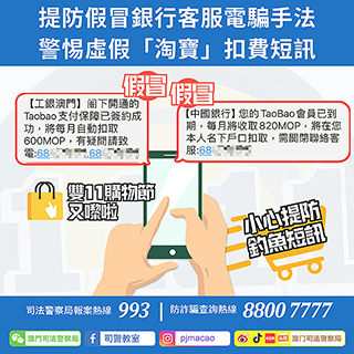 【特訊】司警局近日再發現有騙徒假冒澳門中銀及工銀澳門的名義,向市民濫發虛假短訊,訛稱「TaoBao支付保障已簽約成功」或「TaoBao會員已到期」將會扣費,誘騙市民回撥短訊內附帶的電話號碼。當市民一旦回電,騙徒便會冒充銀行職員,再指示轉至通訊軟件聯絡,繼而索取銀行或信用卡資料、要求下載APP進行同屏,甚至轉賬至指定戶口。