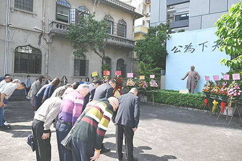紀念國父孫中山先生一百六十歲誕辰致敬典禮昨午一時許假紀念館花園舉行,臺北經濟文化辦事處秘書劉明率各界近百名人士齊向孫中山塑像行三鞠躬禮。