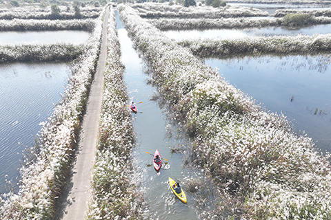 ◎ 十一月十三日,遊客在花林畈天然濕地公園泛舟,享受皖南初冬季節的溫暖陽光。花林畈位於國家水利風景區──安徽省寧國市青龍灣庫區上游的甲路鎮周灣村,總面積千餘畝,水位隨著季節變換,消落增長,形成了優美的天然濕地。自然更新下的蘆葦叢生、草木豐盛。良好的生態環境使其成為鳥類的理想棲息地和候鳥的停歇地,每年蘆花競相綻放時,藍天白雲,白鷺點點,蔚為壯觀。如今,這裡已成為極具特色的戶外攝影網紅地。(無人機照片)(中新社發 毛建軍 攝)