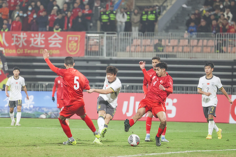 第6分鐘,中國隊帥惟浩接角球傳中,頭球破門。第24分鐘,帥惟浩又接萬項的傳球,完成「雙響」。第27分鐘時萬項製造點球機會並親自主罰,以一個假動作騙過對方門將,打球門左下角得手,中國隊上半場以3:0領先。