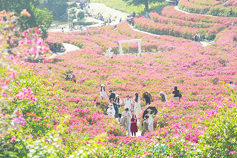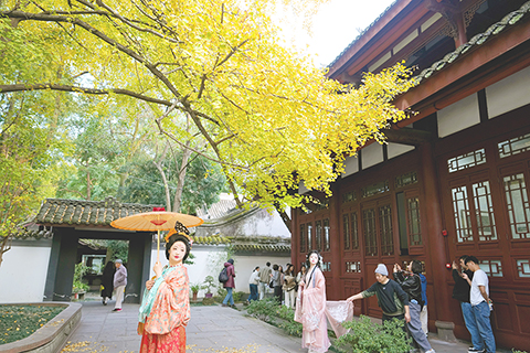 ◎ 十一月二十三日,四川成都,遊客身著古裝在成都杜甫草堂博物館內的銀杏樹下拍照留念。立冬過後,成都漸漸進入了銀杏的觀賞季,金黃的銀杏為城市增添了浪漫與詩意。(中新社記者 安源 攝)