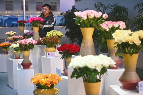 ◎ 十一月二十四日,在位於甘肅蘭州新區現代農業投資集團花卉產業基地四號溫室內,工作人員打理花卉。該基地採用無土栽培、智能溫控等科技手段保障花卉品質,業務已拓展至十個國家。今年以來,當地鮮切花出口額已突破七百五十萬元人民幣,較去年增長三十多倍。(中新社記者李亞龍 攝)