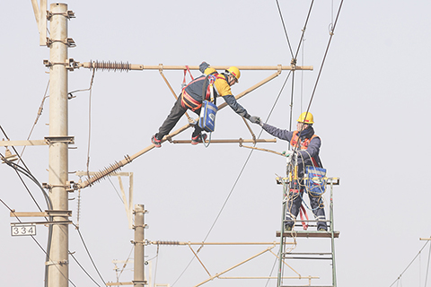 ◎ 近日,隨著華北地區氣溫降低,煤炭運輸需求日漸攀升。中國鐵路北京局集團有限公司唐山供電段出動百餘名檢修人員在唐山市曹妃甸地區對遷曹鐵路開展接觸網全面檢查及專項整治作業,保障這條北煤南運重要能源通道的牽引供電設備運行安全。圖為十一月二十六日拍攝的檢修現場。(中新社記者賈天勇 攝)