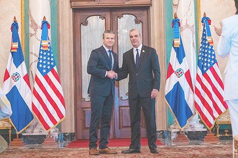 ◎ 多米尼加總統阿比納德爾十一月二十六日宣佈,多方將允許美國使用其境內聖伊西德羅空軍基地和美洲國際機場的部份限制區域,以協助「打擊毒品走私」。圖為當日,在多米尼加聖多明各,多米尼加總統阿比納德爾(右)與來訪的美國國防部長赫格塞思在多總統府會晤。(新華社發 多米尼加總統府供圖)