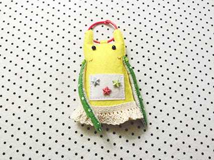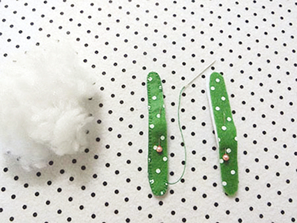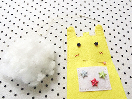 (六)用珠針將兩塊娃娃布重疊並固定好,並在適合位置上套入已對摺好的布帶布,再以鎖針的方法縫製及塞滿棉花。