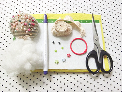 (4)黑色、杏色、紅色、白色、黃色、綠色線卷各一個,手針一支,剪刀一把,珠針一盒,水消筆一枝,棉花少許,膠水一支,綠色小鈕釦兩粒,長手針一支,紅色大鎖扣圈一個,小黑色珠兩粒,中彩色星星鈕釦三粒,2cm闊米色橡筋花邊少許。