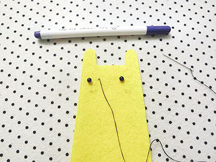 (二)在一塊娃娃布的布面適合位置上,用筆畫上眼睛、腮紅,縫上黑珠及繡出腮紅的形狀。