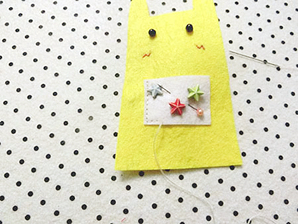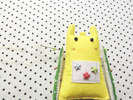 (五)用珠針將兩塊手部布重疊並固定好,再以鎖針的方法縫製及塞滿棉花。