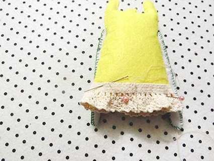 (八)用珠針將橡筋花邊繞圈固定在娃娃身體的適合位置上,再以斜針的方法縫合。