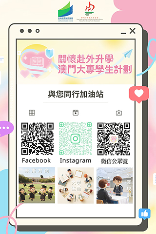 為進一步擴闊資訊傳遞與互動渠道,教青局推出「與您同行加油站」Facebook專頁、微信公眾號以及Instagram帳號(gotyourback_hub),定期發佈與校園生活、心理健康及生涯規劃等相關的實用資訊,為赴外升學澳門大專學生提供更全面的支援服務。教青局未來將繼續與社會各界共同做好關懷赴外升學澳生工作,構建良好的環境,助力青年學生實現理想,回饋社會。◇