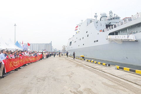 ◎ 當地時間十二月七日,正在執行遠海綜合實習任務的中國海軍九八九編隊抵達印度尼西亞雅加達丹戎不碌港,開始對印度尼西亞進行為期四天的友好訪問。中國駐東盟使團工作人員、中國駐印度尼西亞大使館工作人員、留學生代表、當地華僑華人代表、印度尼西亞海軍官兵代表等四百餘人到碼頭迎接。(中新社記者李志全 攝)