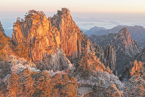 ◎ 十二月十四日,雪後初霽的黃山風景區,絢麗日出與奇松、怪石交相映襯,熠熠生輝,吸引眾多遊客前來賞雪觀景。(無人機照片)(中新社發 施亞磊 攝)