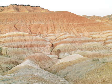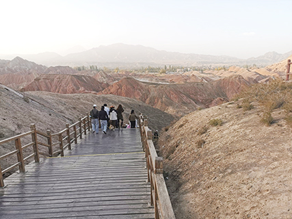 午餐後,團隊乘車前往張掖市,參觀世界十大神奇地理奇觀—張掖七彩丹霞地質公園。那裡雖然沒有藍天碧海、高原綠草的景致,但卻有世界上少有的水色胭脂的如畫般美景,也是現今國內唯一的丹霞地貌與彩色丘陵景觀高度複合區。它以氣勢磅礡、形態豐富、色彩斑斕而著稱,具有極高的觀賞和重要的科考價值,過去多部電影如《太陽照常升起》《三槍拍案驚奇》和《神探狄仁傑(第三部)》等,均是在此區拍攝外景的。