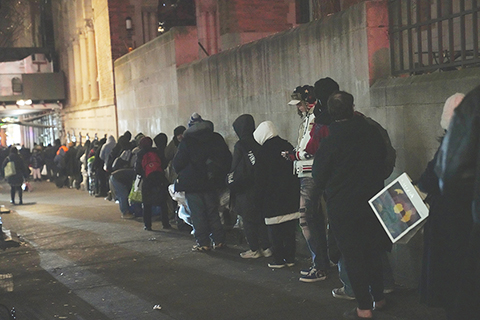 ◎ 十二月十七日,數百名無家可歸者和其他需要救助的人在美國紐約曼哈頓的一個救助點排起長隊,在暮色中等待領取一份免費晚餐。圖為當日,在美國紐約曼哈頓的一處救助點,人們排隊等待領取免費晚餐。(新華社記者 張鳳國 攝)