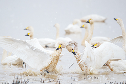 ◎這是十二月四日在東古湖拍攝的小天鵝。東古湖位於湖南省岳陽市屈原管理區,是洞庭湖生態區的重要組成部份。每年十一月,大量候鳥南飛至此棲息越冬。二0二0年,東古湖首次監測到來此越冬的小天鵝。近年來,當地實施了水質淨化、食源地補充、微地形改造、水生植被恢復、鄉土樹種補植等生態保護和修復工程。隨著越冬候鳥種群數量的增加,東古湖成為熱門觀鳥目的地。(新華社發 周洋 攝)