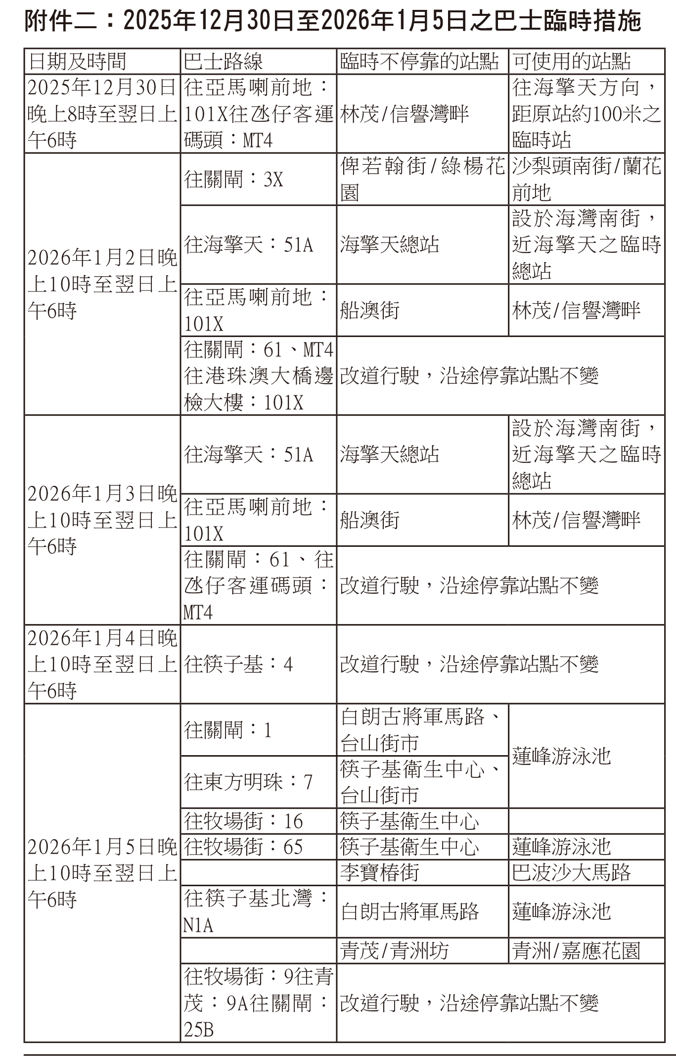 巴士方面,二0二五年十二月三十日晚上八時至翌日清晨六時以及二0二六年一月二日至五日每日晚上十時至翌日清晨六時,多條巴士路線需配合改道措施而臨時改道行駛及調整部份停靠站點,詳情可查閱附件二或兩巴網頁(澳巴:http://www.tcm.com.mo、新福利:http://www.transmac.com.mo)。◇