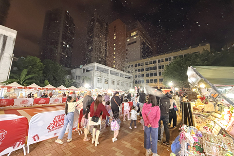 由北區工商聯會主辦的北區冬日市集一連九天在青洲坊蓮花廣場舉行,約有四十商戶參與,當中包括文創、美食、遊戲攤位等,現場還有聖誕老人、飄雪、心願樹等節目,讓大眾可在活動場地一站式體驗北區味道及感受聖誕氛圍。昨日所見,不少家長帶同子女到場,活動設有消費獎賞,在攤位消費滿五十元,可獲得遊戲卡,參與BINGO遊戲,贏取豐富獎品。