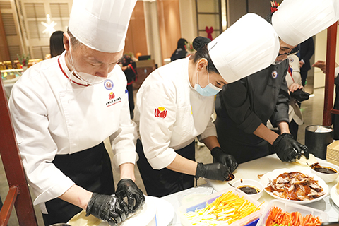 在北京烤鴨攤位前,哈薩克斯坦姑娘拉扎特正配合中國師傅出餐。抹醬、放葱絲、加黃瓜條、捲餅,她的動作乾脆利落。趁著空當,她還會留意學習師傅的片鴨刀法。