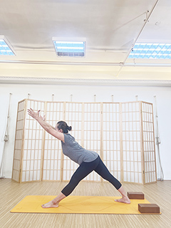 隨著背部延展,地上可放二塊木磚或其他堅實的物體作為支撐物以支撐身體。身體向前傾,雙手帶動則軀幹延展,左右兩邊平衡對稱,身體緩緩向下,手扶著地上的支撐物,注意無論支撐物的高度是否變動,背部延展的狀態都要繼續保持,控制呼吸節奏,令呼吸變得暢順溫和,最後雙手扶腰直背站起來。