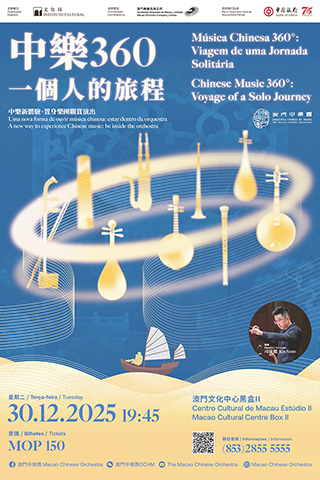 由文化局主辦,澳門樂團有限公司承辦,澳門中銀支持的澳門中樂團樂季《中樂360》音樂會,將於12月30日(周二)晚上7時45分在澳門文化中心黑盒劇場II上演。《中樂360》將突破慣常欣賞音樂會的安排,讓觀眾的多重感官沉浸於音樂會之中,享受一趟獨遊音樂旅程。