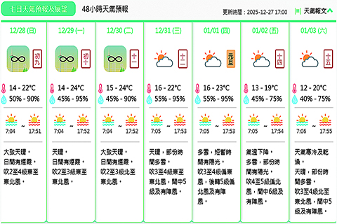 預測今日大致天晴。日間有煙霞。吹二至四級東至東北風。氣溫約為攝氏十四至廿二度。相對濕度介乎百分之五十至九十之間。預測最高紫外線指數約為六,級別屬於高。◇